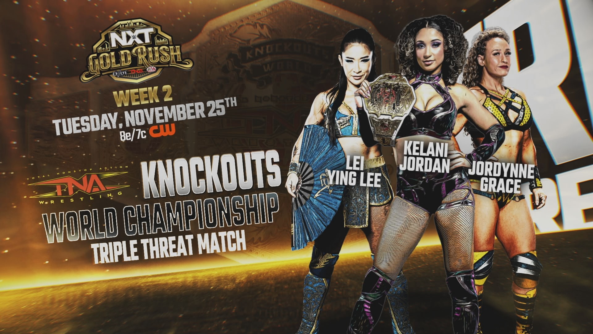 Next Tuesday at NXT Gold Rush Week Two, the TNA Knockouts World Championship is up for grabs as Kelani Jordan defends against Léi Yǐng Lee and Jordynne Grace.