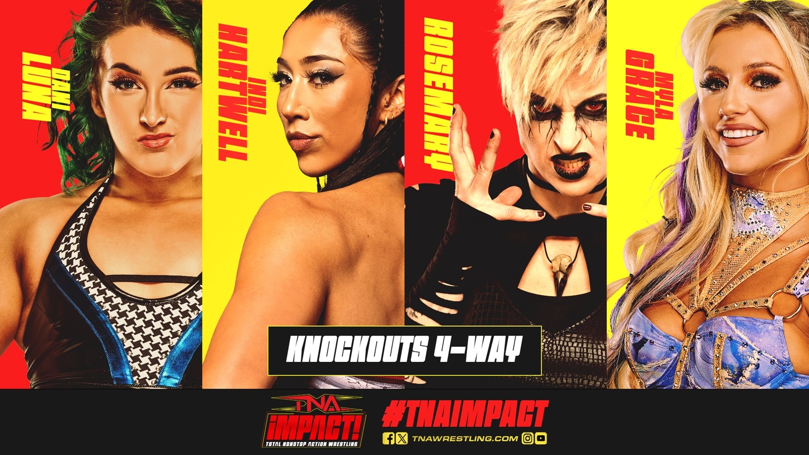 The winners of two Knockouts 4-Way matches will face off in two weeks for a TNA Knockouts World Title opportunity at Final Resolution! First, Dani Luna, Indi Hartwell, Rosemary and Myla Grace collide. The bell rings and Luna immediately attacks Hartwell. Rosemary counters Hurts Donut but Hartwell hits a powerslam instead. Luna and Rosemary pull Grace and Hartwell to the outside. Rosemary fends off Luna with a warning of green mist. Rosemary bites Hartwell. Grace soars off the top, wiping out Rosemary on the floor. Meanwhile, Luna and Hartwell take each other down with double clotheslines. Rosemary introduces a steel chain but Grace sends her face-first into the post. Luna uses the chain on Hartwell to score the victory.