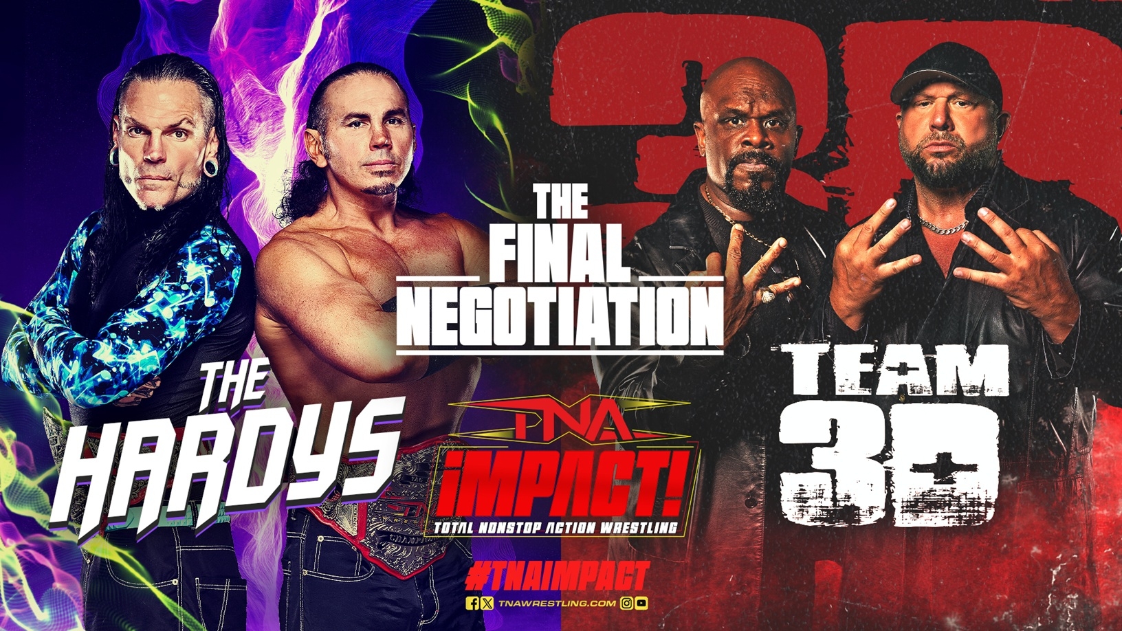 Director of Authority Santino Marella presides over The Final Negotiation between The Hardys and Team 3D ahead of their last showdown at the biggest event of the year, Bound For Glory! Both duos share tremendous respect for each other as perhaps the two greatest tag teams of all time. They reminisce about their previous encounters, and up the ante for one last match at Bound For Glory: it will now be a Tables Match for the TNA World Tag Team Championship!