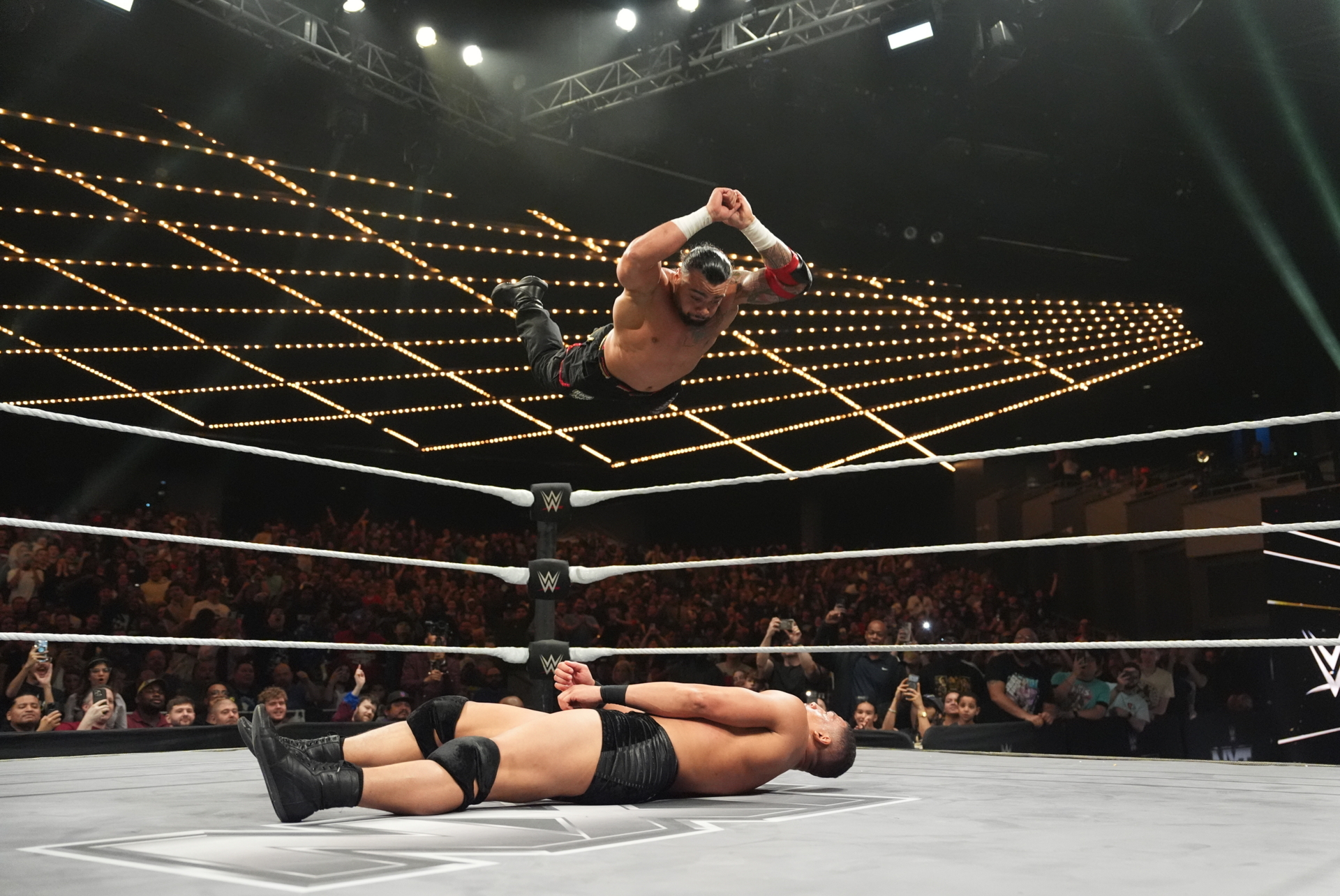 Mike Santana dropped Dion Lenox with a Rolling Buck 50. He dove through the ropes to take out the remaining members of DarkState. Santana crashed down from the top ropes with a Frog Splash, he went for a cover, and Dion kicked out at two.
