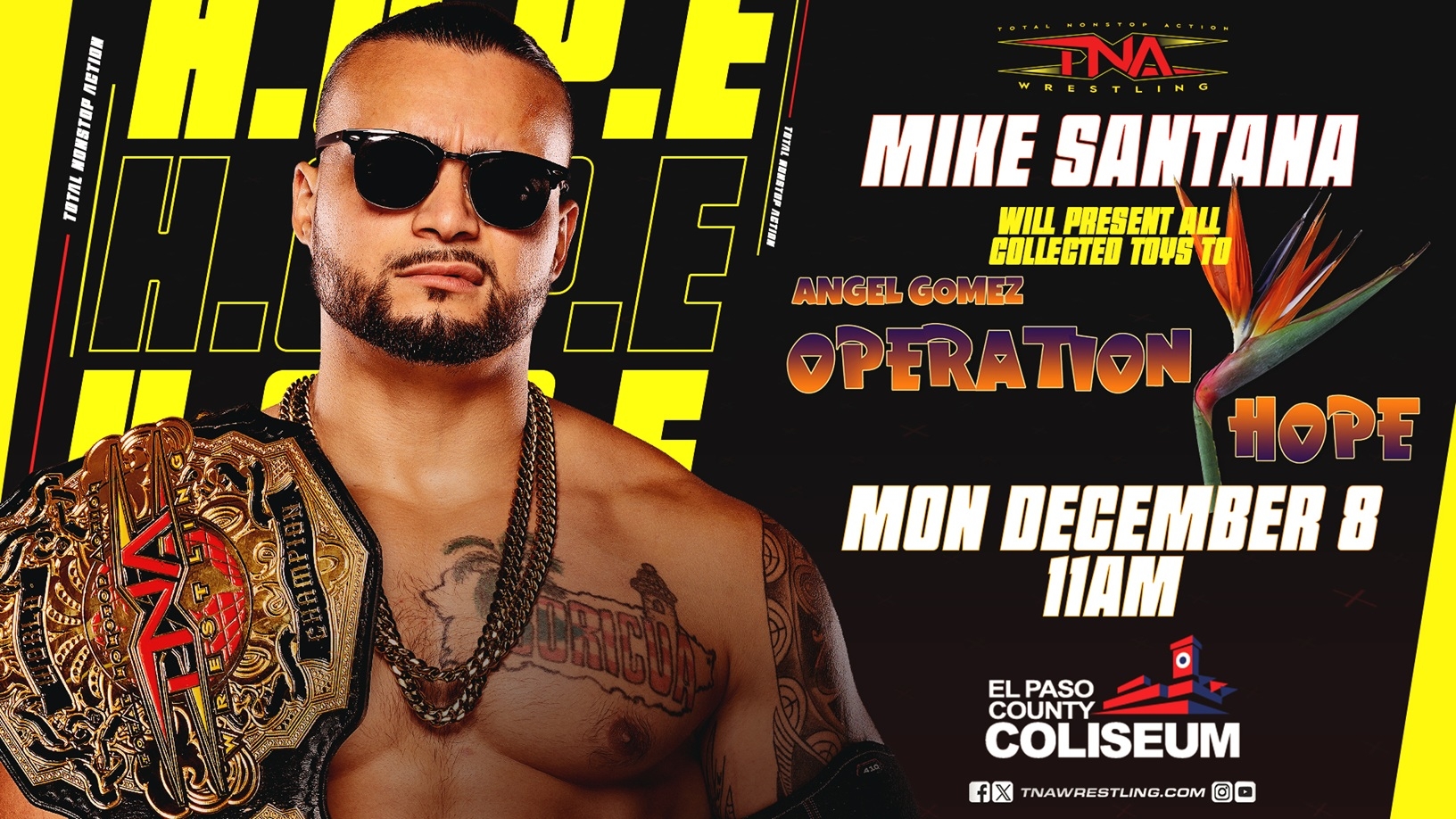 The annual TNA Toy Drive will be held all three days in El Paso (December 5-7) and fans attending the action-packed pro wrestling shows are encouraged to bring a new, unwrapped toy. TNA Wrestling World Champion Mike Santana will make the formal presentation of all collected toys to Operation H.O.P.E. on Monday, December 8, at 11am local time inside the El Paso County Coliseum.