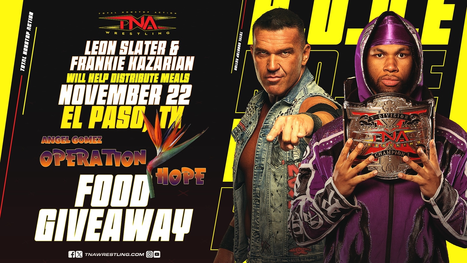 On Saturday morning, November 22, in El Paso, former TNA International Champion Frankie Kazarian and reigning TNA X Division Champion Leon Slater will join volunteers from Operation H.O.P.E. for their 30th annual Thanksgiving Food Giveaway to area families in need.